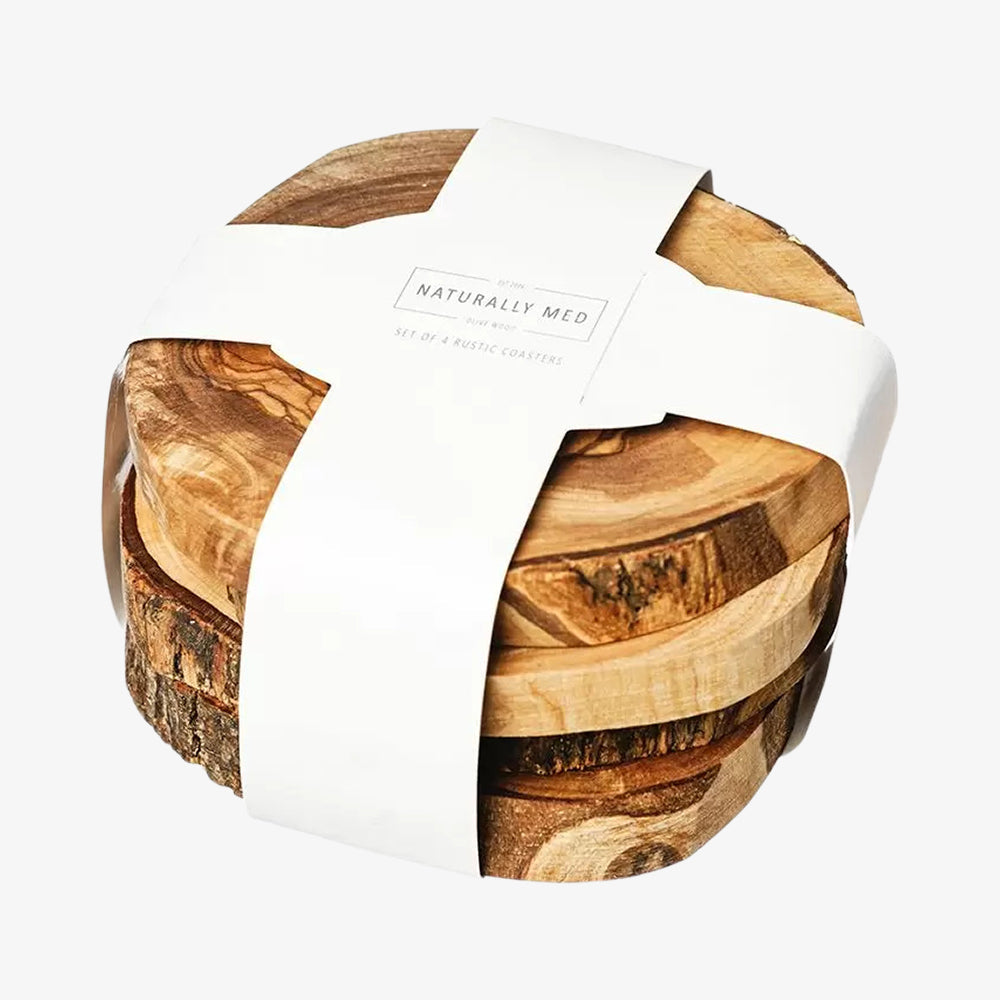 A nice set of 4 handmade glass pieces in olive wood. They can also protect your table from heat. 7.5cm (dia) x 4.5cm (h)