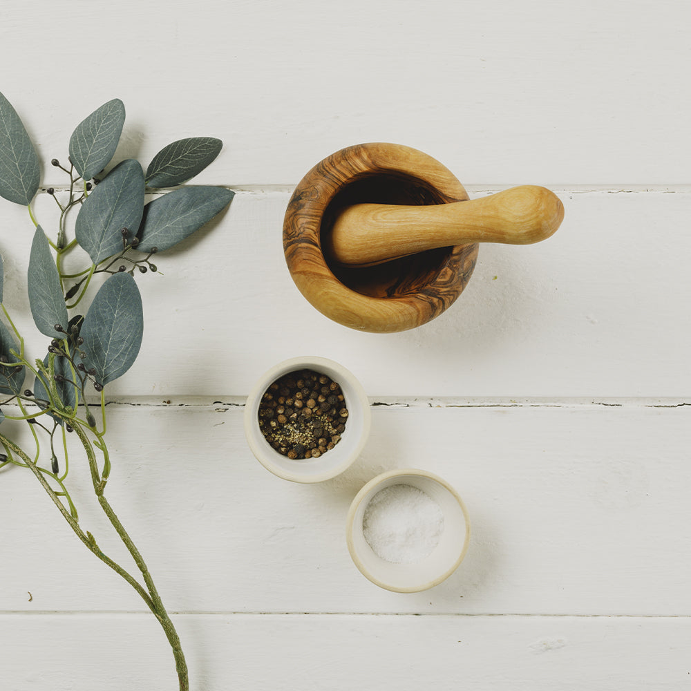 This neat bumps and mortar sets are perfect for when painting spices, prurers, marinades or you want to make your own pesto, this bump and mortar is everything you need. The kit is made of olive wood and measures 10cm (dia) x 5cm (h)).