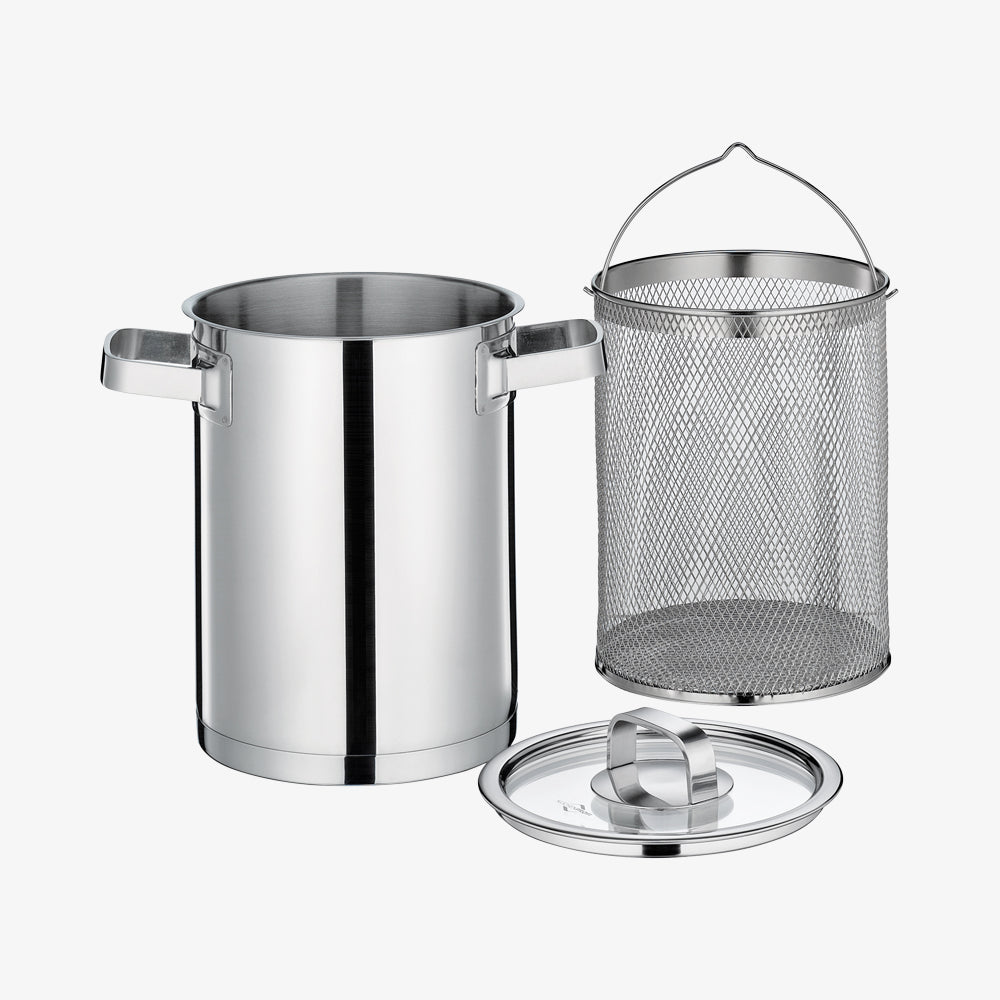 The asparagus cooker from KüchenProfi comes with a 21 cm tall pot, glass lid and a door stroke with handles that fit into the pan. The high pot causes the sensitive asparagus heads to be gently cooked. Asparagus the cooker works for all stoves, also induction. The door stroke with handles makes it easier to take the asparagus out when done and drain them. The practical pot is ideal for fully enjoying the asparagus season. The pot has a circumference of 16 cm and can contain 4 liters.