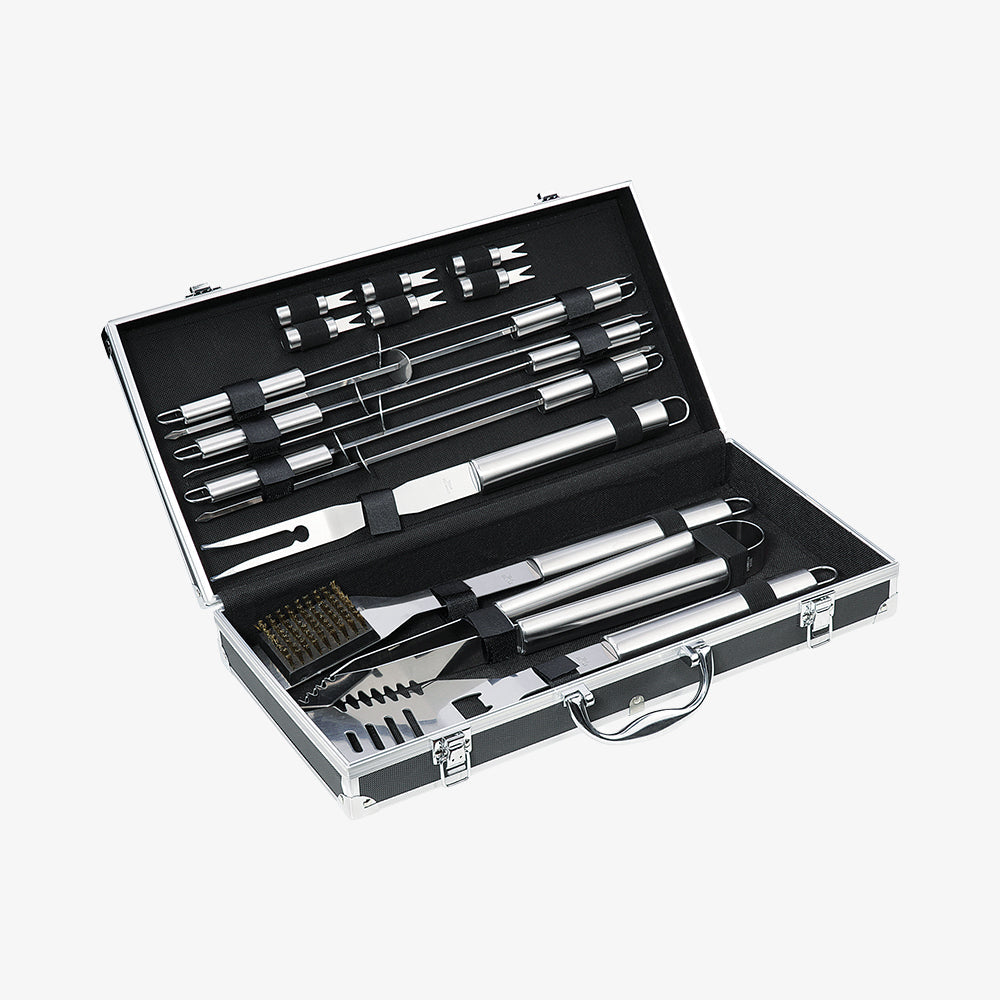 Grillsett fra Küchenprofi. Med dette settet har du alt du trenger til grillen. Settet består av 16 deler. Den er laget av rustfritt stål og er utrolig slitesterk. Et grillsett i superfint design, med en kjempefin koffert.