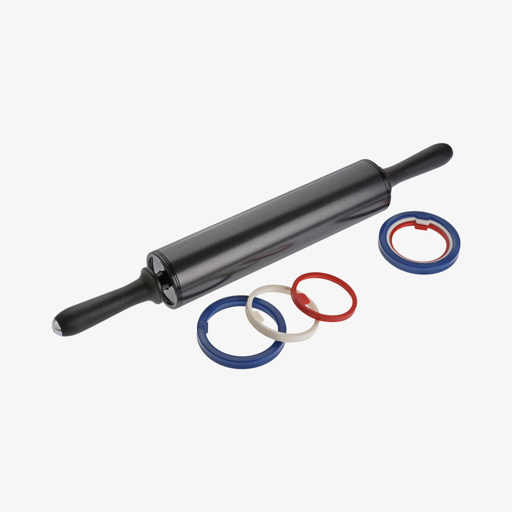 Den justerbare kjevlen kan brukes både som en vanlig kjevle, men kan også justeres slik at deigen din kan få en presis tykkelse på 3 mm, 6 mm og 12 mm ved hjelp av de avtagbare ringene. Kjevlen har et non-stick-belegg, slik at du også kan jobbe med deiger som fester seg lett, som fondant eller marsipan. Kjevlen er 49 cm lang.