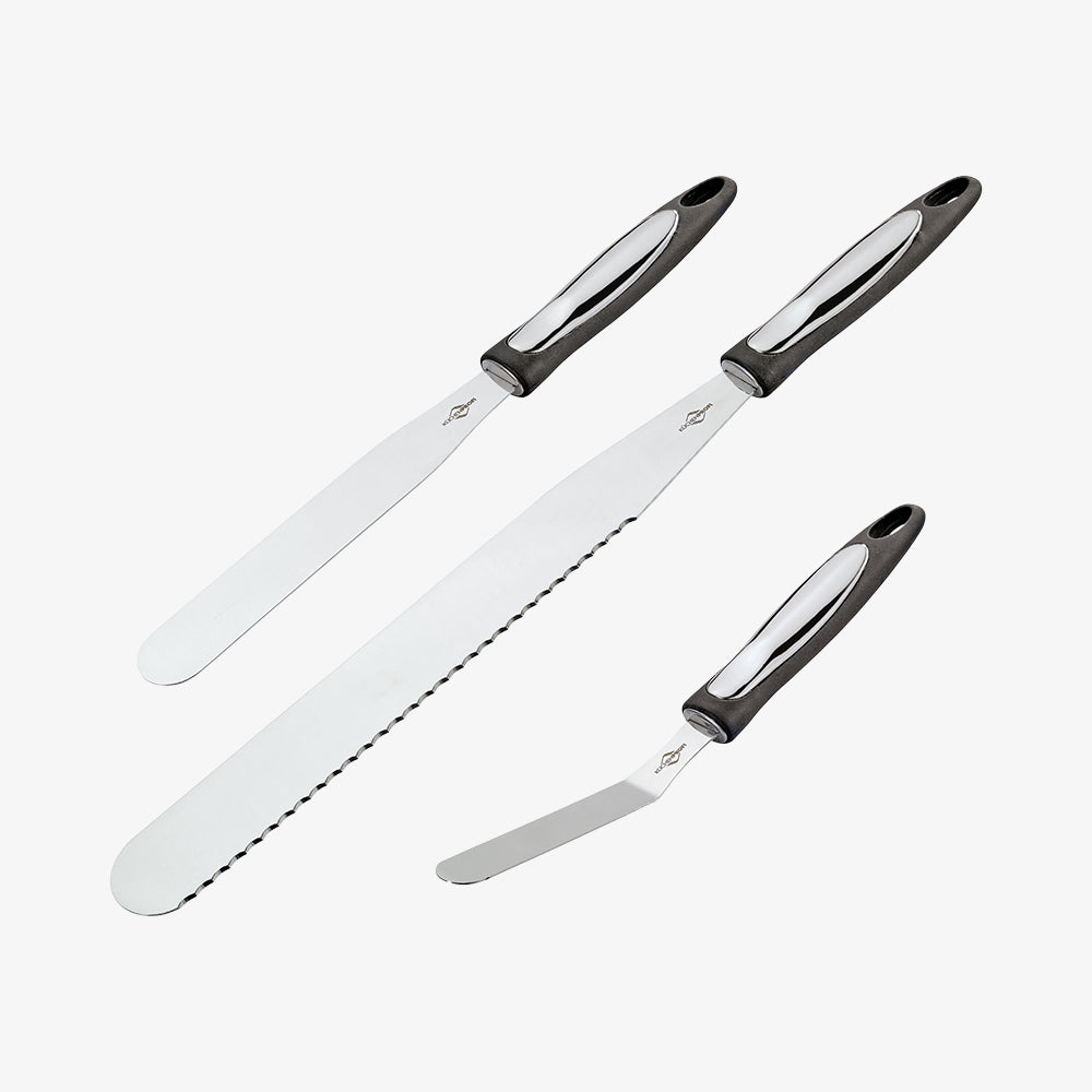 Konditorspadesettet består av en kakekniv med glatt side, en slikkepott og en vinklet slikkepott. Med den taggete kanten på kakekniven i rustfritt stål kan du enkelt kutte kakebunner. Den taggete kanten på kakekniven kan også brukes til å lage et bølget design på kakekremen. Du kan bruke slikkepotten til å fordele store mengder krem og fyll. Vinkelspaden er god til finjusteringer og til å fordele krem og fyll i springformer og andre vanskelige former. Alle konditorspadler er laget av rustfritt stål og plasthåndtak. Spatlene er henholdsvis 39 cm, 29 cm og 25 cm.