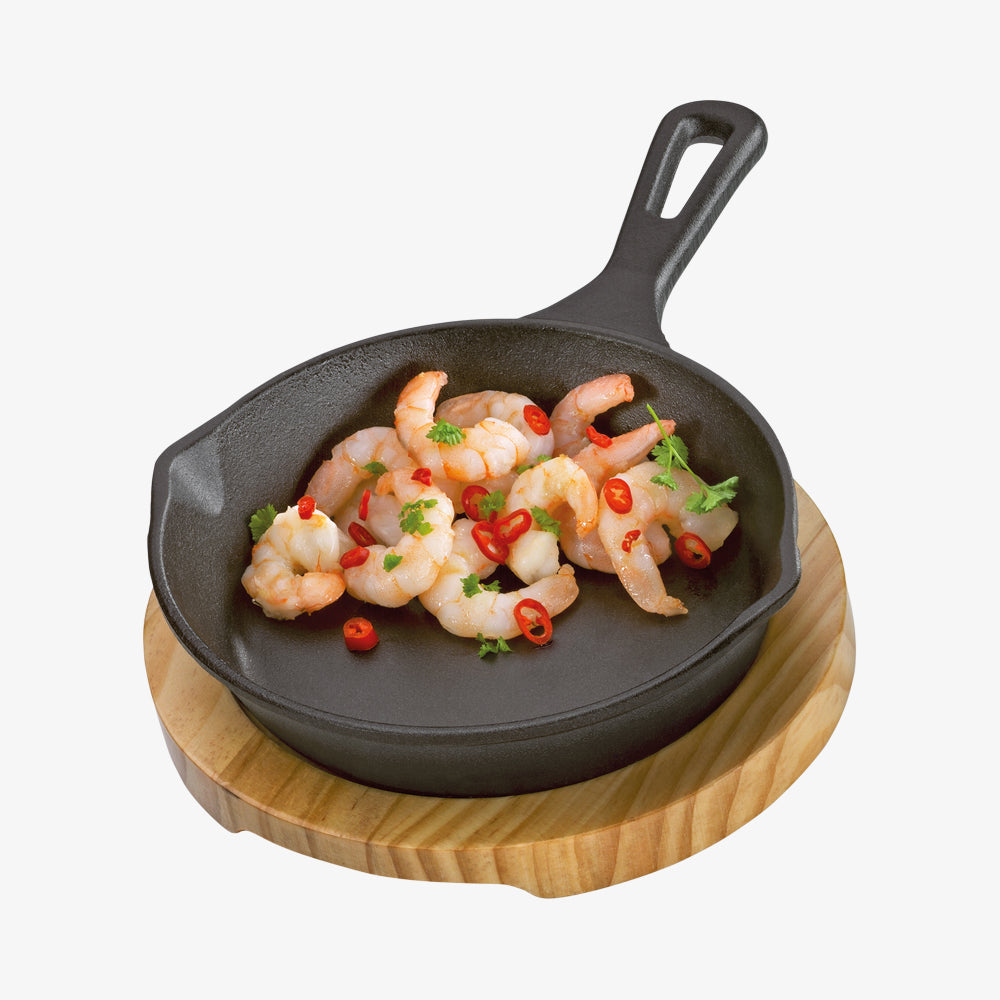 Tilbered mindre retter og tilbehør over grillen, uten at marinaden og den deilige smaken drypper ned i åpen ild. Den varmebestandige støpejernspanna holder maten varm lenge. Bruk støpejernspanna som et miljøvennlig alternativ til engangsbrett i aluminium. Pannen kan også brukes på komfyren og i ovnen. Pannen leveres med furubrett, som er ideell for servering. En fordypning i brettet holder pannen på plass. Støpejernspanna og brett måler 26 x 18 x 6 cm.