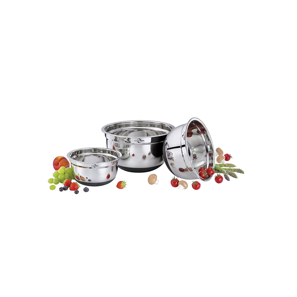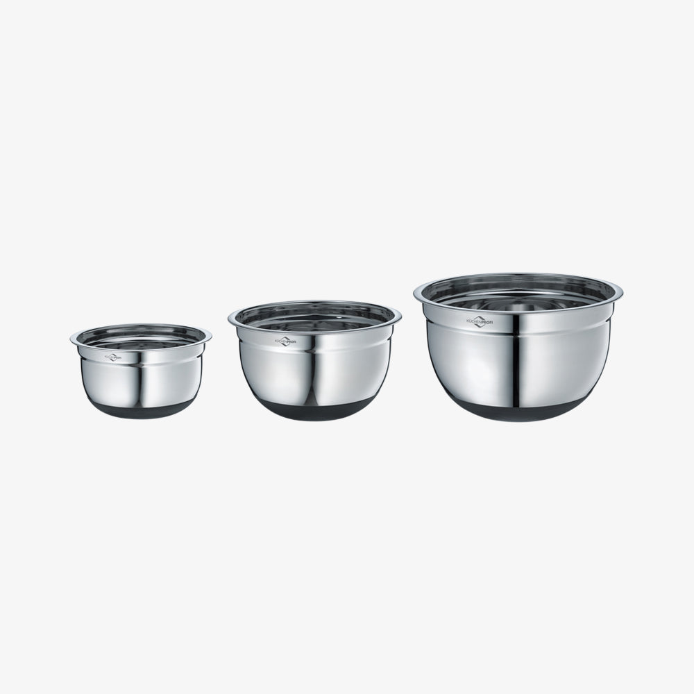 De flotte Røreskål fra Küchenprofi er lavet i rustfrit stål med en gummibase. Stålet efterlader ingen smag i maden og gummibasen sørger for at skålene ikke smutter, når du arbejder i køkkenet. Skålene fås også enkeltvis.