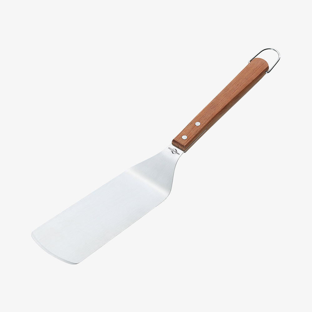 Den professionella paletten i robust rostfritt stål är utrustad med ett rosenträhandtag och en praktisk hängare. Rosenträ är särskilt tätt och hårt och används ofta i möbelkonstruktioner. Paletten är 45 cm lång, så du kan säkert vända maten och hålla ett säkert avstånd från värmen. Perfekt för alla som älskar att grilla, även året runt.